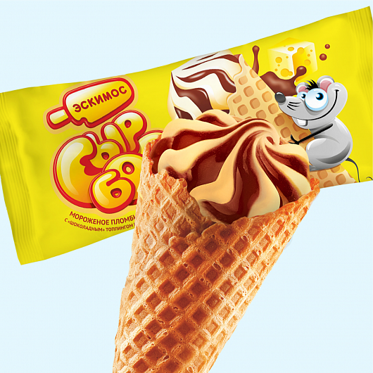 Мороженое пломбир со вкусом сыра с «шоколадным» топпингом в вафельном сахарном рожке «Сыр-Бор», 12%, 75г.