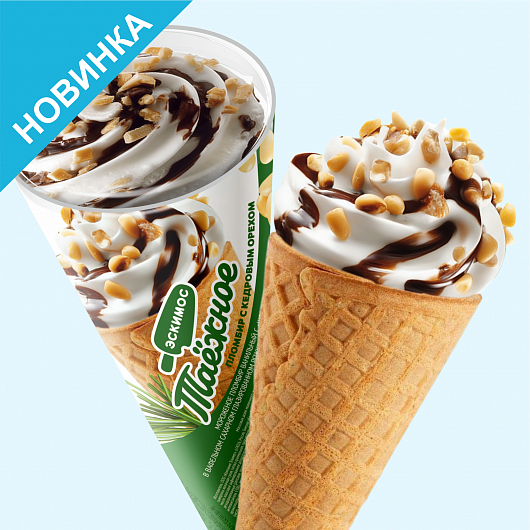 Мороженое пломбир ванильный c «шоколадным» топпингом в вафельном сахарном глазированном рожке, декорированное кедровым орехом, 15%, 70г