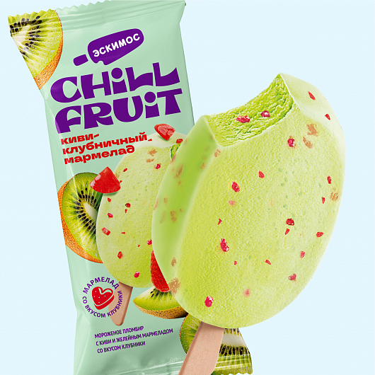 Мороженое пломбир «Chill Fruit» с киви и желейным мармеладом со вкусом клубники, 15%, 65 г. Штрих-код: 4660105724599