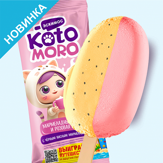Мороженое двухслойное сливочное со вкусом мармеладных сливок и вишневой колы с кусочками фруктового мармелада 10%, 65г Штрих-код: 4660105726005