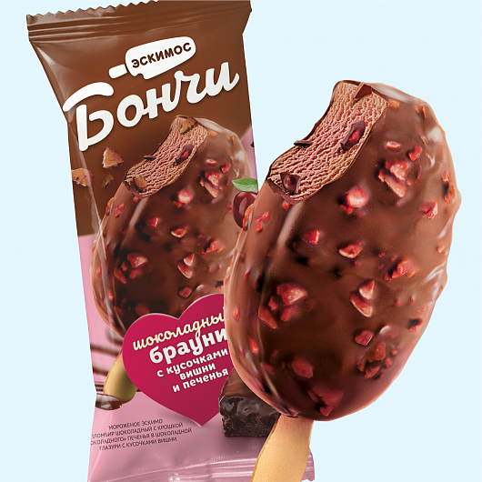 Мороженое «Бончи» пломбир шоколадный с крошкой шоколадного печенья в шоколадной глазури с кусочками вишни, 15%, 65 г.