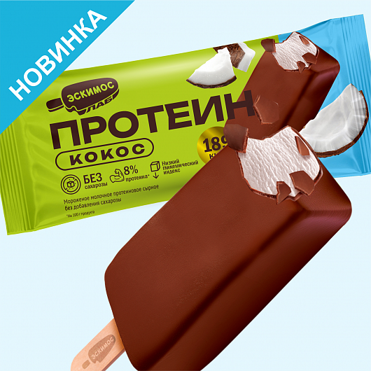 Мороженое эскимо молочное протеиновое кокосовое в глазури с растительным жиром без добавления сахара, 6%, 75гр